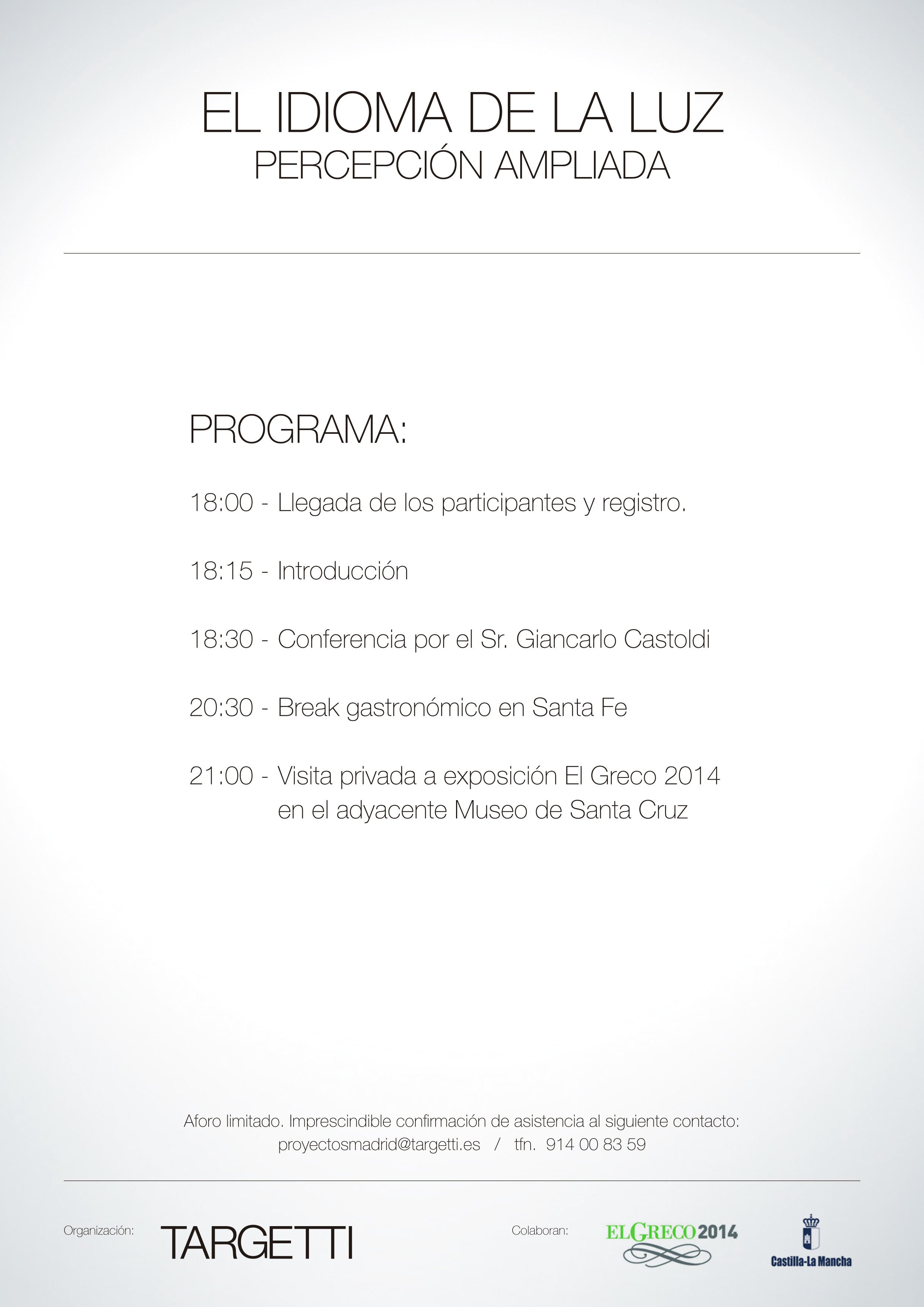 En exclusiva, para los seguidores de nuestro blog, la firma de proyectos de iluminación de exposiciones TARGETTI, nos invita a participar en el evento que se celebrará en la Capilla de Santa Fe de Toledo, donde podremos disfrutar en vivo y en directo de los resultados sobre las obras del Greco tras aplicar la nueva tecnología LED, sistema innovador utilizado por dicha compañía TARGETTI. La visita privada se acompañará con una explicación más técnica y profusa de la mano de Giancarlo Castoldi, la cual ayudará a valorar nuestra percepción de las soluciones aplicadas de una manera más completa. Os adjuntamos el programa y la carta de invitación para que confirméis vuestra presencia; tened en cuenta que hay muy pocas plazas por lo que tendréis que daros prisa para hacer vuestra reserva. Al ser de aforo muy limitado, tendrán en cuenta que estéis relacionados directamente con campos profesionales de la museografía, y si es en iluminación mejor, en otro caso puede que no acepten vuestra solicitud de participación en el evento.